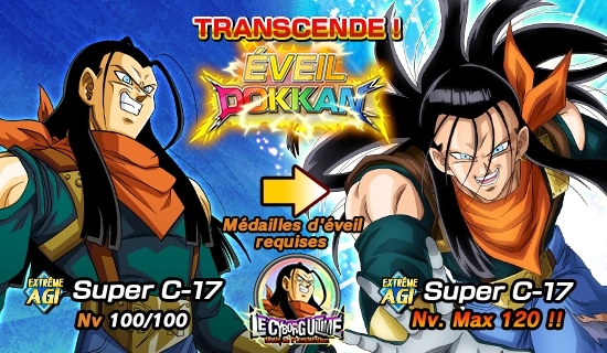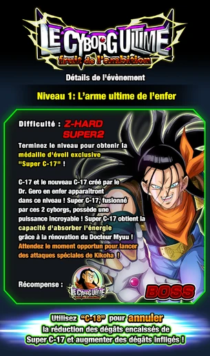 | Un événement extrêmement difficile a commencé ! Venez défier Super C-17 pour obtenir les médailles d’éveil nécessaires à l’éveil Dokkan ! |